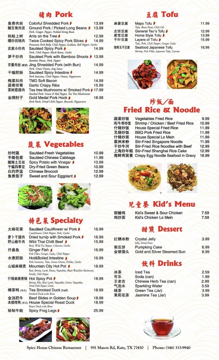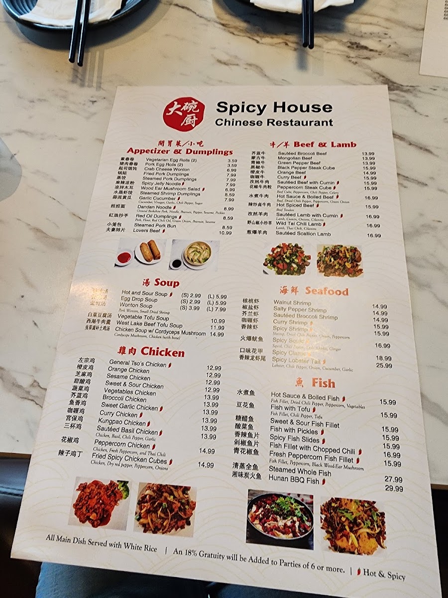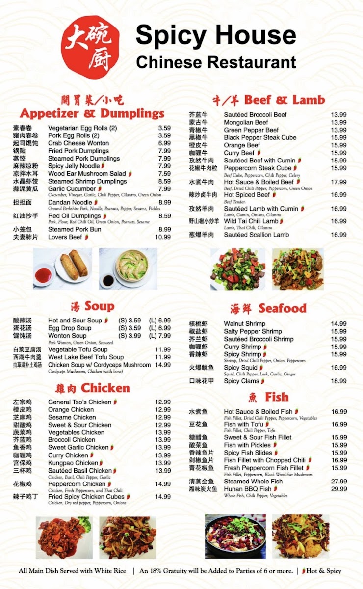 The menu at Spicy House offers a well-rounded selection of Chinese dishes, crafted for both casual meals and more leisurely dining experiences. With a range that includes satisfying soups, vibrant stir-fries, and comforting noodle dishes, the menu balances familiar favorites with bold, spicy flavors that suit a relaxed, unpretentious setting.